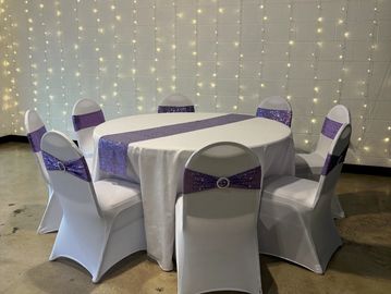 Includes your choice of white or black table linens, paired with matching chair covers. Customize your look with a table runner and chair sash or bow in your preferred color—ask about our current selection of colors and textures. Each table comfortably seats up to 8 guests.